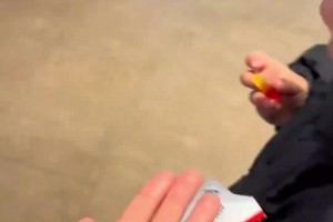 女子向孩子要糖,男孩撤回吃过的